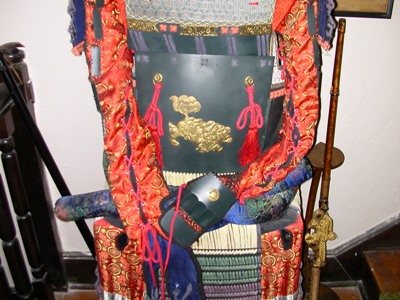 This figure shows the display of another suit of armor. Notice that the first suit had large plates in the body armor; whereas this suit has many smaller plates connected by silk cords. The display of this suit also includes other traditional accoutrements.