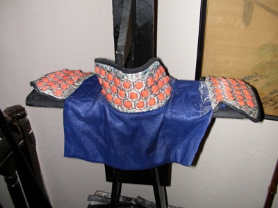Japanese (Samurai) armor served the same purpose as the armor of European knights - protection. Unlike European armor, which evolved into rigid plate armor, Japanese armor was more like the European scale armor, which consisted of small plates linked together, in some ways intermediate between chain mail and plate armor. The Japanese armor, while varied in detail, basically consisted of iron plates of various sizes and shapes connected with silk cords. The plates were overlapped to provide protection, while the silk connections allowed for flexibility. While this design provided advantages in use, it does cause problems in displaying the armor, as their is no human body to give it support.