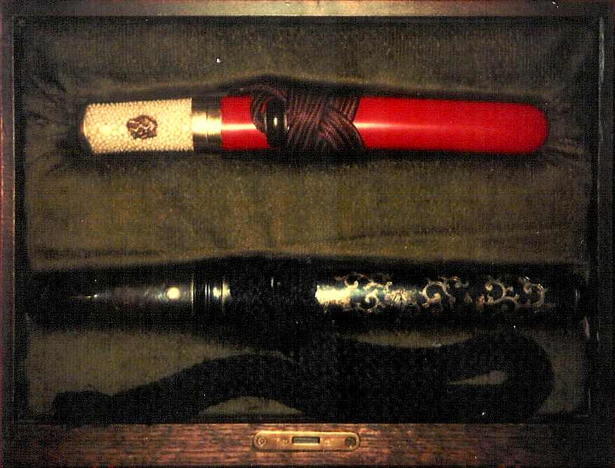 ![]() Mumei (Masahide school?) Ivory fuchi-kashira signed Masatsugu (famous netsuke maker). Silver dragon menuki, horn "points" on rattan wrapped saya high relief mother of pearl carved dragon kozuka. Polished |