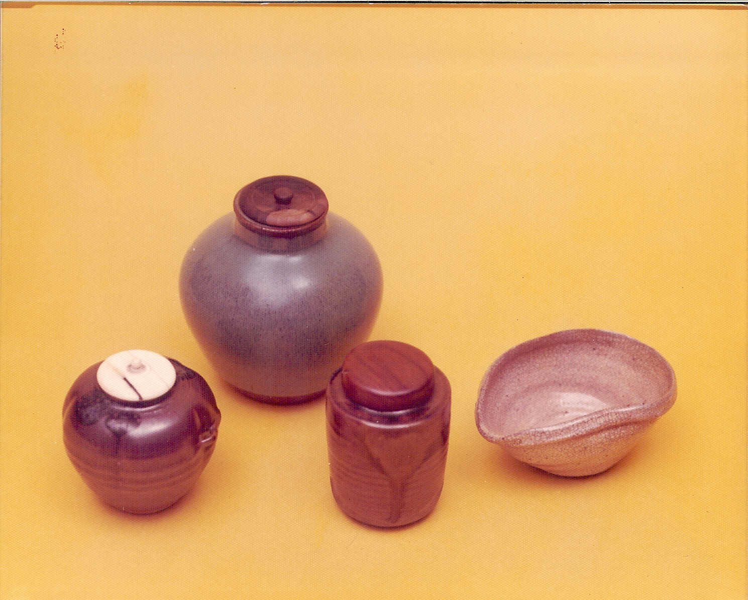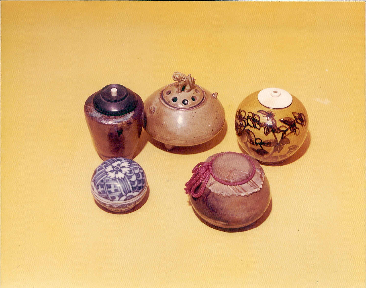 ![]() Rear L to R: Hozon tea caddy (cha-ire) [ex Brundage Coll] Korean Koryo dynasty incense burner (Koro) Chinese Ming dynasty (Hsuan Te Nien Chih) cha-ire Front L to R: Siamese Sawan Khalok incense box (Kogo) Takatori (Satsuma) cha-ire |