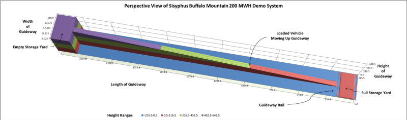 The demonstration Sisyphus system has a nominal energy storage rating of 200 megawatt hours (MWH). That is 200 MWH are stored by the system. With an efficiency rating of >90%, this means that ~180 MWH will be recovered. The storage rating is defined by physical parameters of system height (640 m), weight per block (100 metric tons), and number of blocks moved (1148). The potential energy stored in one 100 metric ton block raised 640 m is 0.1742 MWH. Lifting 1148 blocks stores 200 MWH. Keeping 1148 blocks alternately at the foot of the grade and the top of the grade requires two storage yards of ~3.2 acres, each. The layout also requires ~6300 m of guideway. Vehicles will move at ~60 miles per hour between the storage yards. Higher speeds are easily possible; however, efficiency losses from increased wind drag reduce the value of higher speeds. It will take the vehicles 14 seconds to reach 60 mph and 14 seconds to decelerate. With an estimated 50 seconds to load a block and 50 seconds to unload it, the total round trip time is about 4 minutes. In order to lift all 1148 blocks during the off-peak hours, 12 vehicles are required ((4 min x 1148 blocks / 12 vehicles) / 60 min/hour = 6.4 hours). Because the peak time is longer than 6.4 hours, the rate of energy recovery can be varied from rapid to slow, depending on needs. In addition to the vehicles, guideway, and blocks, the storage areas will need handling equipment and the entire system requires electrical control and power conditioning subsystems. This Sisyphus system requires no investment in land, as the TVA right of way is sufficient to contain the system. Upon the successful completion of the demonstration system, the entire system can be upgraded to a nominal 1000 MWH of storage. This five-fold increase in storage requires five times as many blocks (5740) and 7 1/3 times as much block storage (23.5 acres per storage yard) [to minimize guideway changes]. However, it only requires 3 1/3 times as many vehicles (40), which comprise the most expensive part of the system, and 1 1/4 times as much guideway (~8020 m) [to account for the increased storage area], which is a moderately expensive part of the system. |